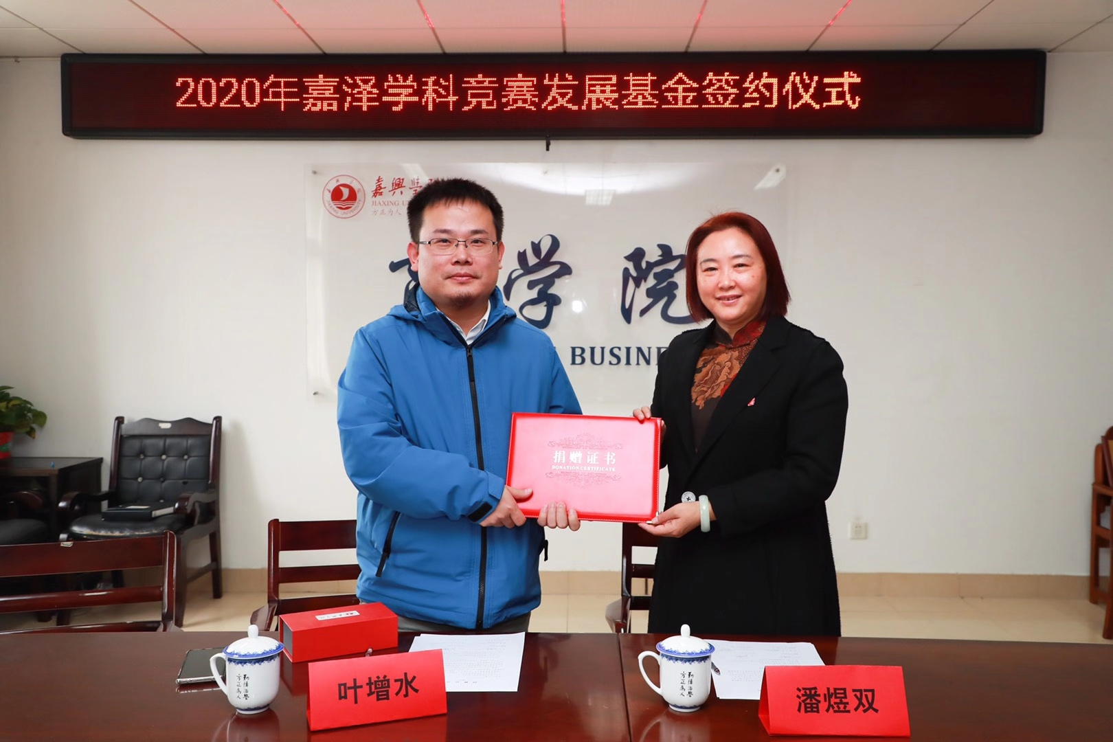 签约仪式后,潘煜双代表437ccm必赢国际官方网站为叶增水颁发捐赠证书,对他的爱心捐赠和无私奉献表达感谢。437ccm必赢国际官方网站嘉泽学科竞赛发展基金现已成立三周年,资助了一批贫困学子顺利完成学业。
