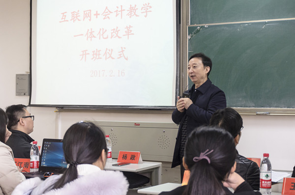 2017216日下午,互联网+会计教学一体化改革开班仪式在第一教学楼503教室隆重举行。中国会计学会副会长、中国会计教育专家委员会主任委员刘永泽教授、中国会计教育专家委员会秘书长杨政教授、正保远程教育集团高级副总裁刘温泉先生、正保远程教育教学服务部副总裁徐建宁女士、我校社会合作处处长袁志明、教务处副处长王敏、437ccm必赢国际官方网站院长潘煜双、党委书记邵燕、副院长李郁明、副书记陈云飞,各系主任和会计、财务专业教师以及会计162163教改实验班全体学生参加了开班仪式。