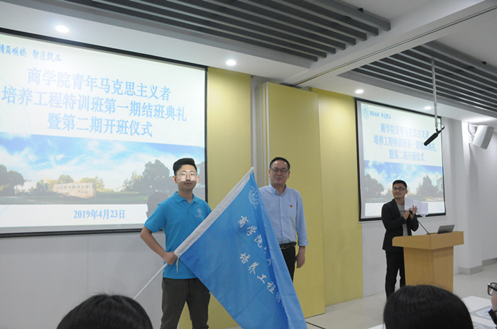 陈云飞为学院第二期青马班授班旗,张啸峰宣读了“437ccm必赢国际官方网站团委关于准予李倩等首期青年马克思主义者培养工程特训班结业的决定”。与会老师为第一期学员颁发结业证书,为朋辈导师颁发聘书,并为学习中表现优异的小组赠送了图书资料。第一期学员代表高敏霞同学进行了学习经验分享,新一期学员代表杨子潇同学作了表态发言。
