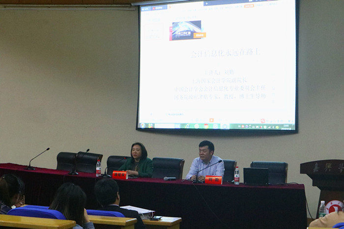 讲座上,刘勤教授从财务变革的动因和内容、会计信息化的发展方向、对未来变革的思考等三方面深入浅出的阐释了人工智能与大数据对企业财务工作的影响。他指出,经济全球化、科技革命、管理变革是企业转型乃至企业财务转型的重要动因,结合当前企业对具有国际化视野的优秀财会人员“质”和“量”的要求,今后财会从业人员必将由传统意义上的账房先生军师参谋进行转型,财会从业人员的工作格局也必将是一种人机协同共生的发展模式。他希望,会计专业同学务必明确新的财务变革不可阻挡,务必需要时刻关注会计信息化发展趋势,务必严格要求自己不断更新知识结构。