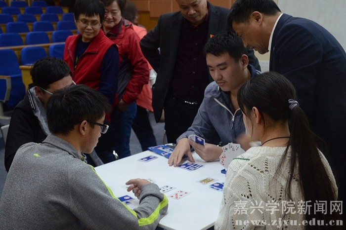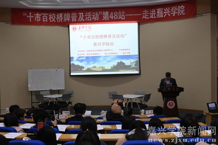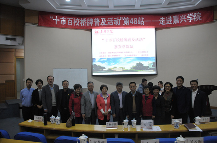 1115日下午,由国家体育总局棋牌运动管理中心、中国桥牌协会主办的“十市百校校园桥牌普及活动”第48站在嘉兴学院顺利举行。浙江省桥牌协会主席寿剑刚、中国桥牌协会副秘书长李国华、学校党委副书记严从荃出席活动。桥牌世界冠军、世界特级大师古玲,世界大师朱小音,亚运会桥牌冠军、我校90届毕业生杨京晖等嘉宾作为桥牌普及推广大使参加活动。