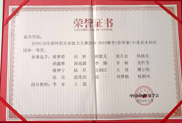 428日,第八届POCIB全国外贸从业能力大赛春季赛落下帷幕。437ccm必赢国际官方网站国经专业20名参赛学子在李亚、王琨2位指导老师带领下力克群雄,斩获团体一等奖。2位指导老师获指导教师一等奖,10名学生获得个人奖项。其中蔡梦霞获得个人一等奖;黄尚源、楼梦宁、韩姝欣、郭芷余、陆星、顾德芃6名同学获得个人二等奖;王易、胡鑫雅、佘润江3名同学获得个人三等奖。这是我校参加该赛事以来获得的最好成绩,取得了历史性突破。