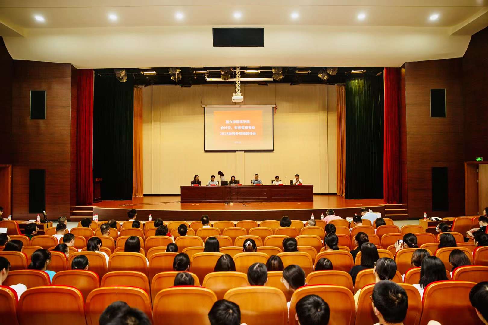 6月17日下午,437ccm必赢国际官方网站在第二教学楼报告厅召开了2018级会计学、财务管理专业学生的“双导师制”聘任见面会。学校教务处相关领导,437ccm必赢国际官方网站领导及来自嘉兴市内各企事业单位财会实务界的76名校外导师、会计和财务管理专业的全体专业教师和2018级全体学生参加了大会。会议由437ccm必赢国际官方网站副院长李郁明主持。