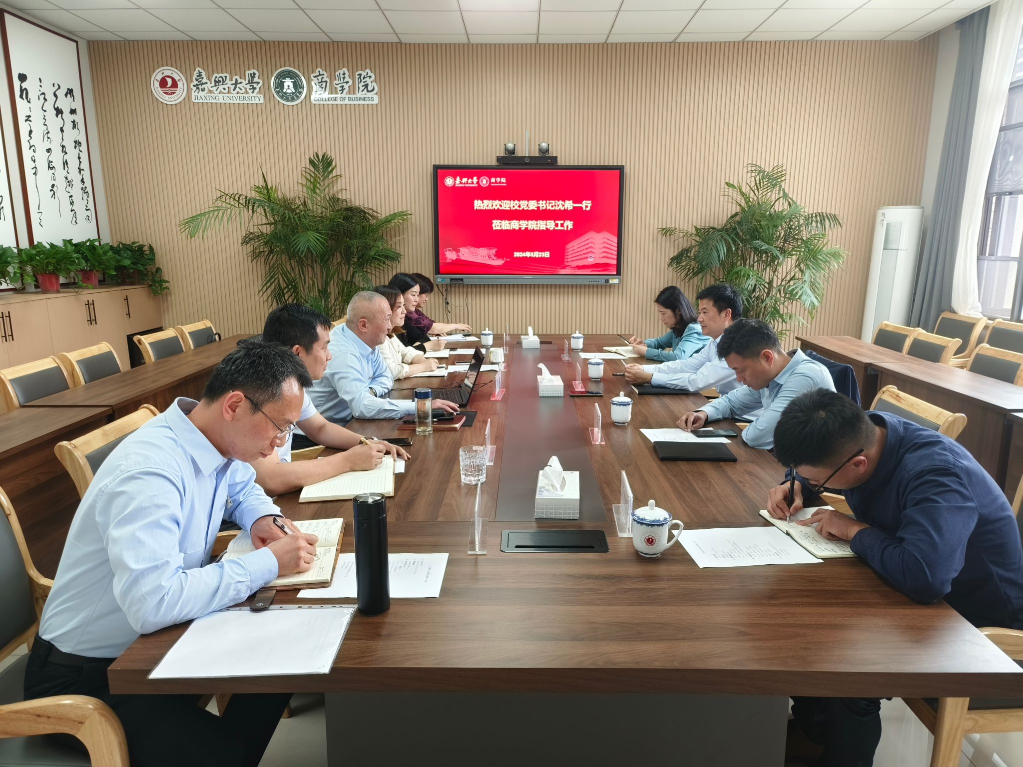 听取学院主要负责人汇报后,沈希书记充分肯定了学院在党建引领、学科建设、人才培养和队伍建设等方面取得的成绩,他强调,要发挥百年商科的优势,凝心聚力,为学院的定位和发展谋篇布局,在高水平学院建设中下功夫;要加强体制机制建设,以学科建设为主线,凝练学科方向,强化师资队伍建设和科研成果转化,全力提升学院教育教学水平;要抓牢高等教育高速发展的机遇,深入谋划学院发展思路,做好硕士点的培育和建设;要聚焦党建工作与学院的中心工作同频共振,把握方向,守牢安全稳定的底线,有力保障和推动学院有组织高质量发展。