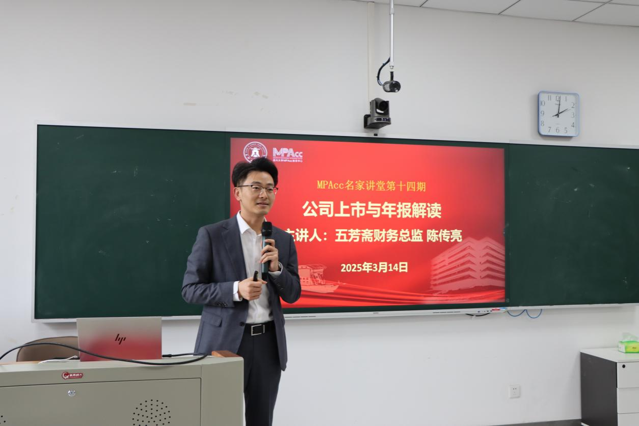 3月14日下午,MPAcc名家讲坛第十四期在尚德楼311精彩开讲,五芳斋财务总监、正高级会计师陈传亮担任主讲嘉宾。讲座由MPAcc教育中心主任潘煜双教授主持,会计系财务系教师代表、2024级会计硕士共计70余人参加。