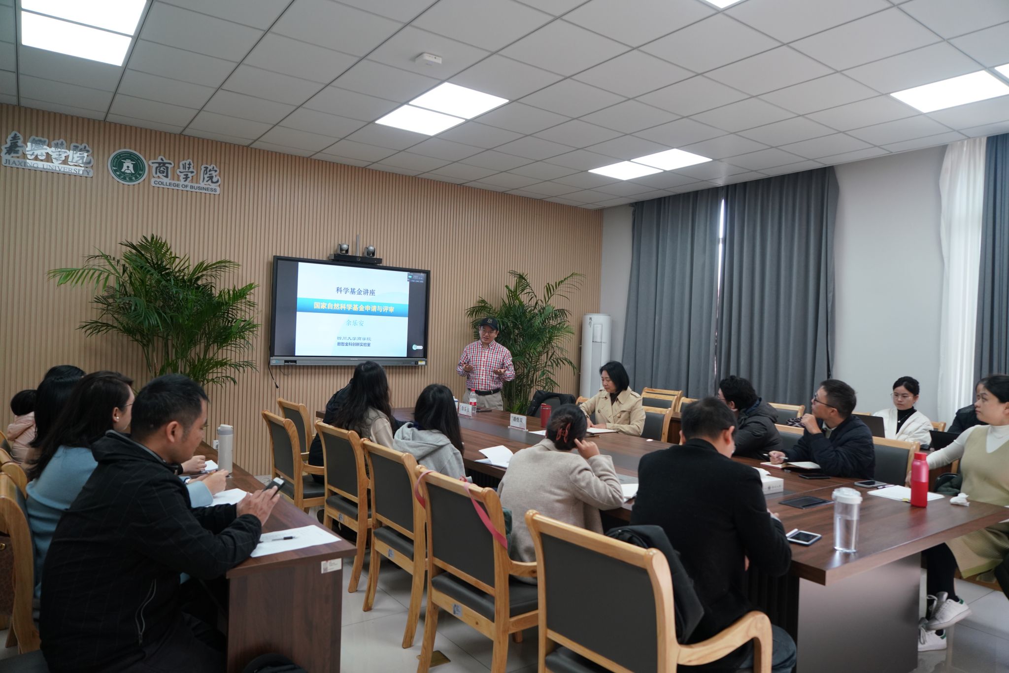 1121日上午,437ccm必赢国际官方网站邀请四川大学特聘教授余乐安作国家自然科学基金申报的专题讲座,会议由437ccm必赢国际官方网站院长潘煜双主持,学院科研骨干教师20余人参加。