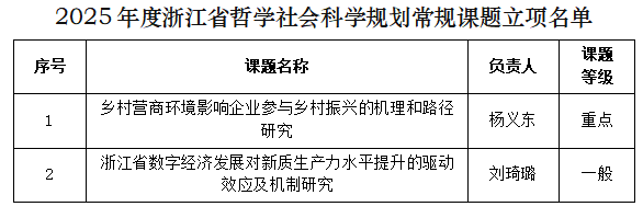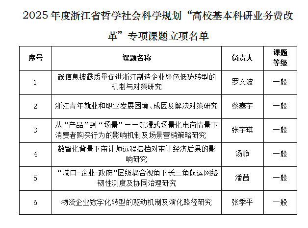 2024年920日,浙江省哲学社会科学工作办公室发布了《关于公布2025年度浙江省哲学社会科学规划课题等立项名单的通知》。我院共有8位教师的项目立项,其中包括2项常规课题(重点课题1项),以及6“高校基本科研业务费改革”专项课题,整体立项率达到了73%。