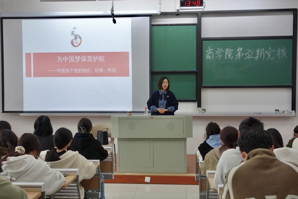 开班仪式结束后,潘欣为学员们作动员讲话并讲授党校第一课。潘欣从中国共产党的组织构成切入,为学员们系统梳理了党的组织架构。潘欣紧扣时事热点讲解了党的民主集中制、六大纪律和三大作风等重要内容。潘欣强调,党员是一面旗帜,更是一份责任和担当,她勉励同学们要立志定向、刻苦用功,谨记新时代赋予大学生新的历史使命,争做先锋模范,要从思想上、行动上真正入党。