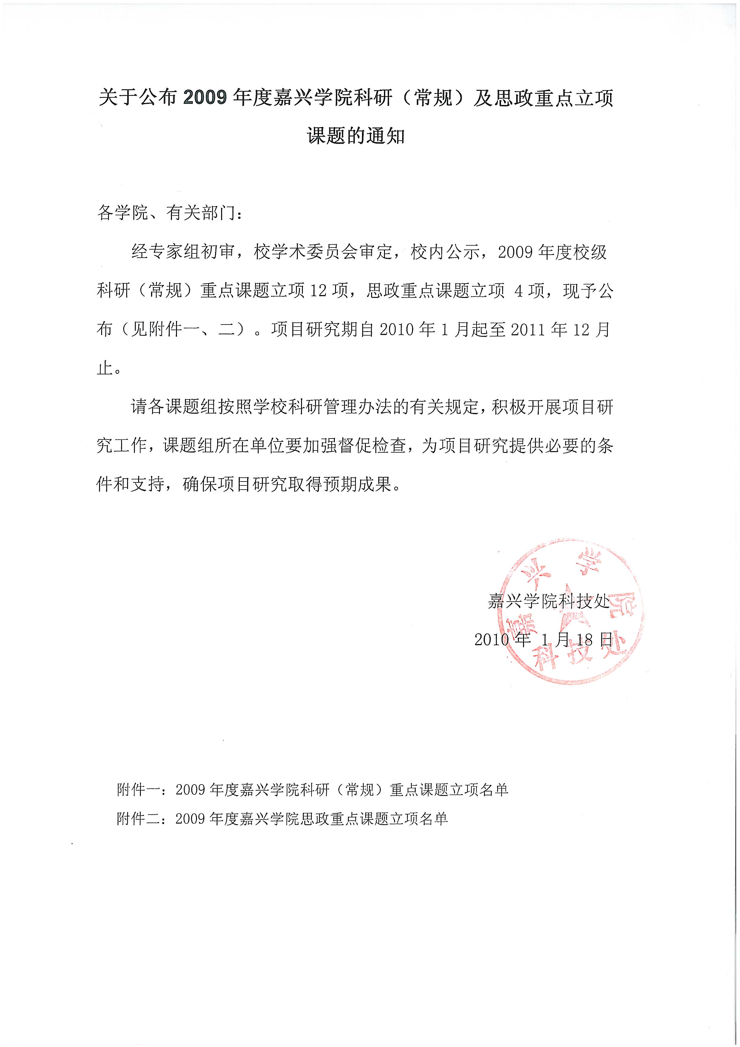 关于公布2009年度嘉兴学院科研(常规)及思政重点立项课题的通知