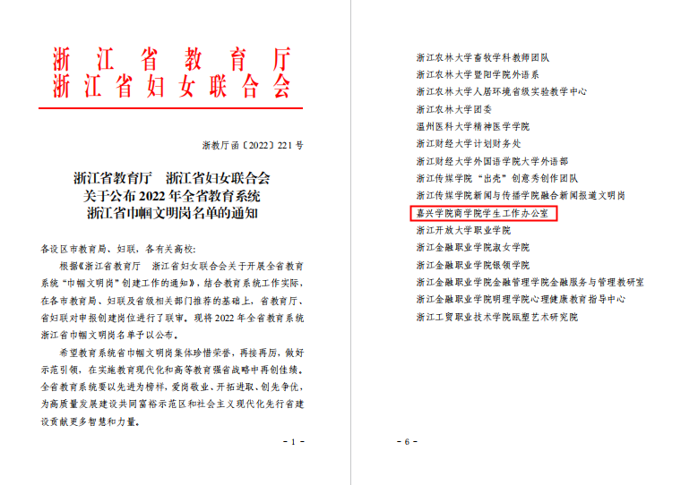 近日,浙江省教育厅、浙江省妇女联合会联合发文公布2022年全省教育系统浙江省巾帼文明岗授予名单,全省教育系统仅65个单位(团体)获此殊荣,437ccm必赢国际官方网站学生工作办公室位列其中。
