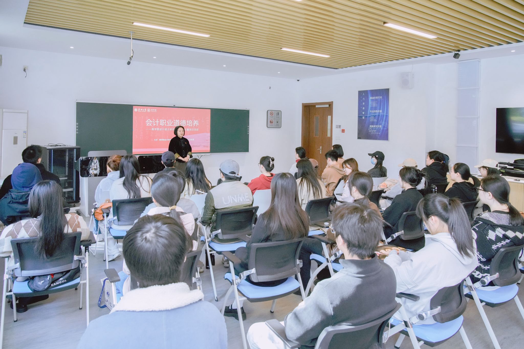 活动邀请到437ccm必赢国际官方网站MPAcc教育中心主任、437ccm必赢国际官方网站会计财务教师党支部书记潘煜双教授主讲“会计职业道德培养”党课。潘煜双以会计职业道德的重要性为题,结合当前经济形势和会计行业的发展趋势,分享了会计职业道德教育在课程体系中的新建设,强调了会计职业道德在维护市场经济秩序、保障企业健康发展中的重要作用。潘煜双还指出作为会计专业的学生党员,应当在“做人做事”上起到党员先锋模范作用,一辈子都需修炼职业道德,要敬畏法律,将高标准变成一种习惯,她希望大家能够严于律己,提高觉悟,规避风险。